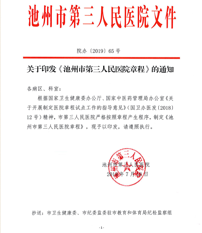 院辦(2019)65號 關于印發(fā)《池州市第三人民醫(yī)院章程》的通知 upload/202012162355855.doc