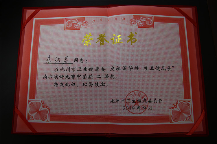 市衛(wèi)健委“慶祖國華誕 展衛(wèi)健風(fēng)采”讀書演講比賽二等獎(朱紹君)