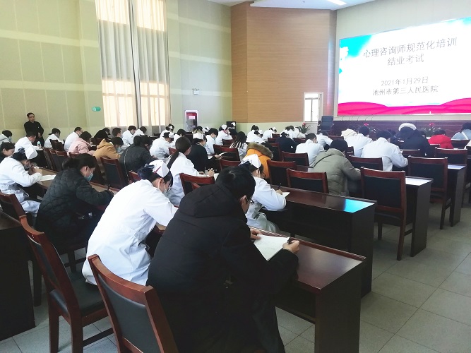 1月29日下午,市三院在門診綜合樓3樓大會議室舉行了心理咨詢師規(guī)范化培訓結(jié)業(yè)考試,全院100余名參訓醫(yī)務(wù)人員參加了考試。