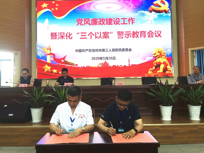 會上,院黨委書記與各分管領(lǐng)導(dǎo),分管領(lǐng)導(dǎo)與各分管科室(病區(qū))負責人院科兩級分別簽訂了《2020年黨風(fēng)廉政建設(shè)責任書》;醫(yī)護人員簽訂《維護醫(yī)?;鸢踩兄Z書》并組織觀看了警示教育片《叩問初心貪欲之害》,以案明紀、以案說法警示黨員干部筑牢思想防線,守住用權(quán)底線,堅決不踩紅線。