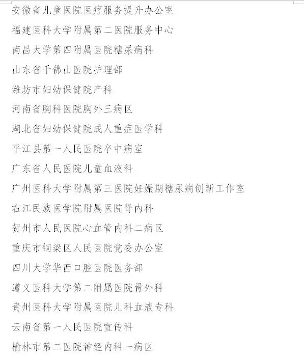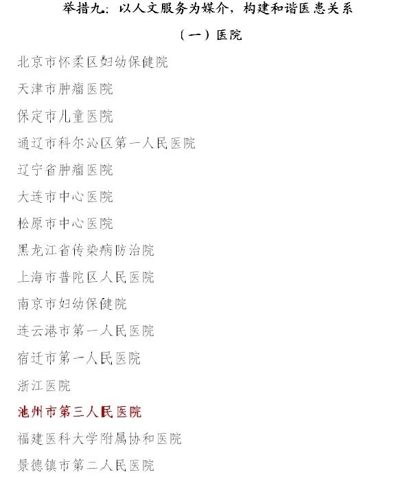 為發(fā)揮先進(jìn)典型的引領(lǐng)作用,推動(dòng)全國衛(wèi)生健康系統(tǒng)廣大干部職工更加積極投身改善醫(yī)療服務(wù)工作中,經(jīng)各地、各有關(guān)單位推薦,按照《關(guān)于印發(fā)進(jìn)一步改善醫(yī)療服務(wù)行動(dòng)計(jì)劃(2018-2020年)的通知》(國衛(wèi)醫(yī)發(fā)〔2017〕73號(hào)),國家衛(wèi)生健康委從改善醫(yī)療服務(wù)的5項(xiàng)工作制度和10項(xiàng)創(chuàng)新舉措等15個(gè)方面,對(duì)北京大學(xué)第三醫(yī)院等484家醫(yī)院,北京同仁醫(yī)院門診部476個(gè)科室、北京同仁醫(yī)院田瑋同志等443名個(gè)人(名單見附件)予以通報(bào)表揚(yáng)。其中池州市第三人民醫(yī)院獲先進(jìn)醫(yī)院表揚(yáng)(舉措九:以人文服務(wù)為媒介,構(gòu)建和諧醫(yī)患關(guān)系)。