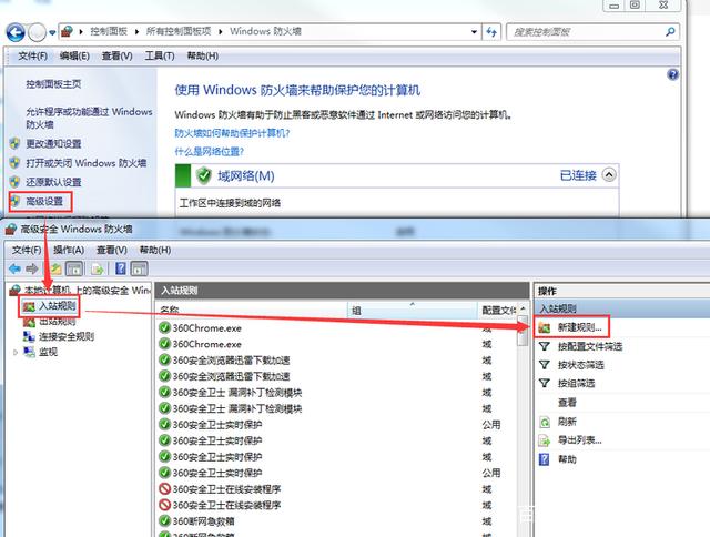 b. 在Windows防火墻中點(diǎn)擊“高級(jí)設(shè)置”,點(diǎn)擊左上角“入站規(guī)則”,然后再選右上角新建規(guī)則