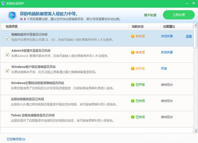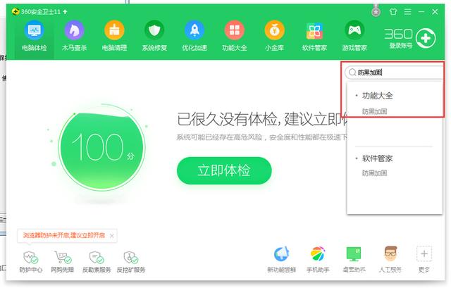 方案4:使用360安全衛(wèi)士“防黑加固”關(guān)閉文件共享、admin$管理共享、遠(yuǎn)程服務(wù)等a.打開360安全衛(wèi)士右上方搜索“防黑加固”打開此工具