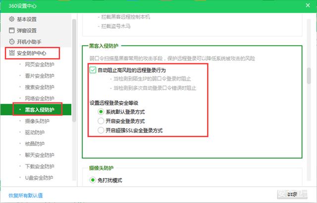 2),打開安全防護(hù)中心,選擇黑客入侵防護(hù),右側(cè)勾選“自動(dòng)阻止高風(fēng)險(xiǎn)的遠(yuǎn)程登錄行為”