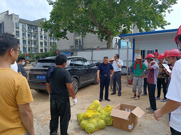 入梅以來,天氣持續(xù)悶熱高溫,但仍有不少一線勞動(dòng)者堅(jiān)守在崗位,經(jīng)受著嚴(yán)峻的“烤驗(yàn)”。“高溫天氣下,一線工人工作強(qiáng)度如何?防暑降溫工作是否安排到位?”帶著滿心的關(guān)懷,7月7日下午,池州市第三人民醫(yī)院黨委書記、院長唐達(dá)亮,黨委委員宋輝攜相關(guān)科室人員,看望慰問堅(jiān)守在市三院二期工程項(xiàng)目施工現(xiàn)場(chǎng)的一線工人,并為他們送去防暑降溫藥品和西瓜。