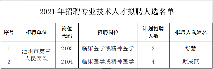 根據(jù)《池州市第三人民醫(yī)院2021年招聘專業(yè)技術(shù)人才公告》規(guī)定,經(jīng)報名、資格復(fù)審、面試、體檢、考察等程序,舒慧、顧成躍2名考生符合相應(yīng)招聘崗位條件,確定為擬聘人員。現(xiàn)將擬聘人員名單予以公示,公示時間為2021年7月15日至7月21日。