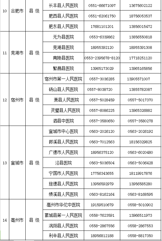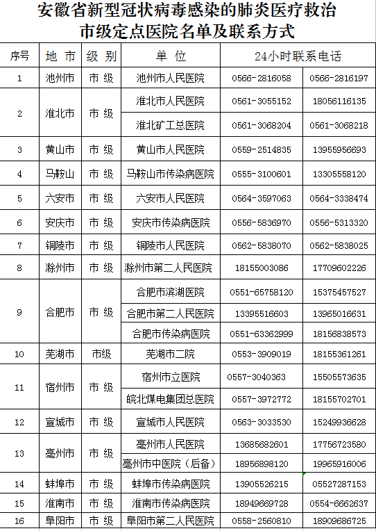 安徽省新型冠狀病毒感染的肺炎醫(yī)療救治市級定點醫(yī)院名單及聯(lián)系方式