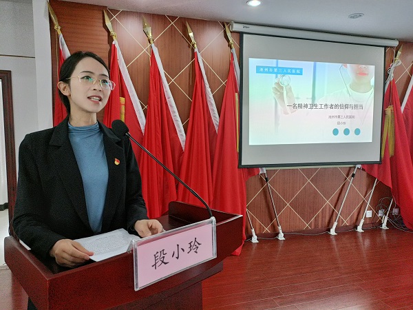 段小玲同志立足崗位實(shí)際向與會(huì)人員分享了她從事精神衛(wèi)生工作的點(diǎn)滴和感悟,努力用愛心、耐心、責(zé)任心去撫慰深受疾病折磨的患者,倡導(dǎo)大家要重視心理健康,關(guān)心關(guān)愛精神疾病患者,消除偏見與歧視,力爭為精神疾病患者及家屬營造尊重、接納、關(guān)愛的良好社會(huì)氛圍,展示了精神衛(wèi)生工作者醫(yī)者仁心的大愛情懷。