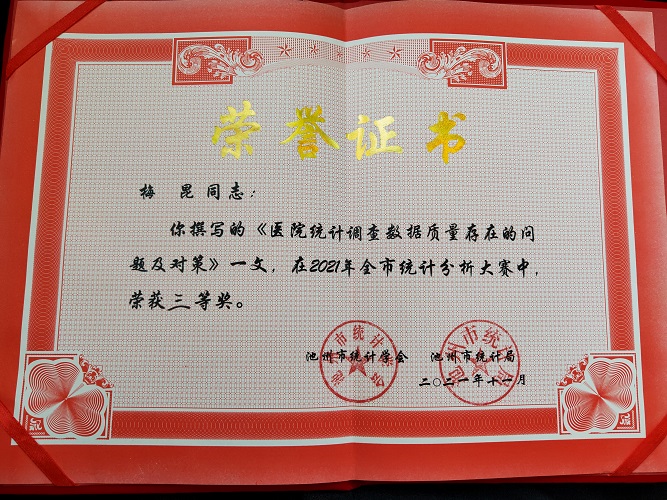 市三院梅昆獲2021年池州市統(tǒng)計(jì)分析大賽其他單位組三等獎(jiǎng)