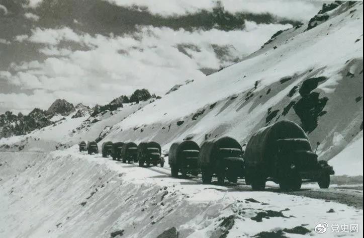 195412月,貫通世界屋脊的康藏、青藏兩條公路全線正式通車。圖為行駛在康藏公路上的車隊。