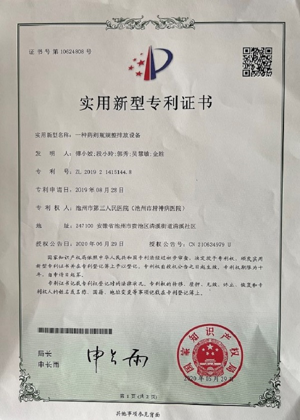 獲得此項(xiàng)專利,再次展現(xiàn)了“吳柳娟學(xué)習(xí)引領(lǐng)團(tuán)隊(duì)”開(kāi)拓創(chuàng)新的精神風(fēng)貌。近年來(lái),市三院高度重視科研工作,全院醫(yī)務(wù)人員參與科研積極性高漲,其中傅小姣等同志申請(qǐng)的“一種藥劑瓶規(guī)整排放設(shè)備”國(guó)家實(shí)用新型專利已獲批,其發(fā)明專利正在申報(bào)獲批中。