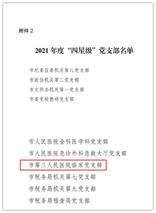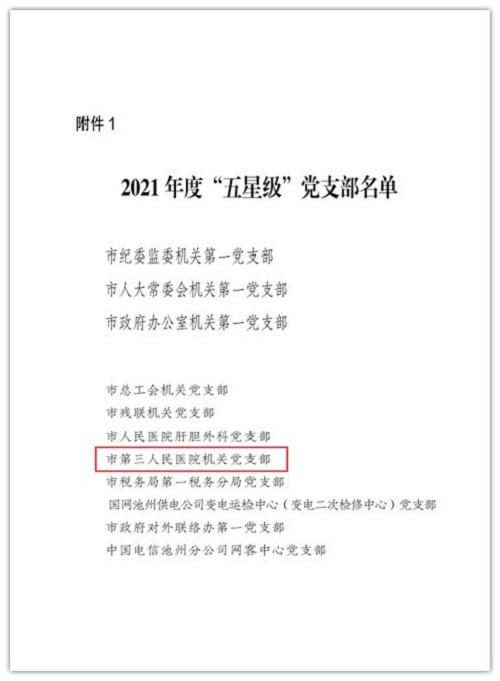 3月29日,從剛剛召開的池州市“2021年度黨組(黨委)書記抓基層黨建述職評(píng)議會(huì)暨2022年度市直機(jī)關(guān)黨的建設(shè)工作會(huì)議”上獲悉,市三院所屬兩個(gè)支部和一名黨務(wù)工作者獲得表彰,機(jī)關(guān)黨支部被市直機(jī)關(guān)工委命名“五星級(jí)”黨支部、臨床黨支部被命名“四星級(jí)”黨支部,機(jī)關(guān)黨支部書記趙炳星獲“優(yōu)秀黨支部書記”榮譽(yù)稱號(hào)。