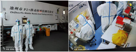 我們的工作地點(diǎn)在馬鞍山市會(huì)展中心廣場(chǎng),放眼望去,這里已停了十來(lái)輛來(lái)自省內(nèi)其他市縣的支援檢測(cè)車輛和旁邊搭起的臨時(shí)帳篷,一切顯得緊張有序。這次池州共派出8名檢驗(yàn)人員,分別來(lái)自市疾控中心、市立醫(yī)院、市二院、市中醫(yī)院等醫(yī)療機(jī)構(gòu)。我們這支隊(duì)伍還有幾位同志是從支援安慶結(jié)束后短暫休整了一夜又匆匆趕過(guò)來(lái)的,感覺疫情期間所有的醫(yī)務(wù)人員都不容易??!當(dāng)天下午我們就上了檢測(cè)車熟悉儀器和操作流程,邊學(xué)邊干、邊干邊學(xué),待到晚飯時(shí)間一出檢測(cè)艙,脫下防護(hù)服,摘下N95口罩后,感覺呼吸好輕松,好舒服。也實(shí)實(shí)在在體會(huì)到了嚴(yán)格防護(hù)下身體的難受,悶熱、呼吸累、口罩勒得人臉頰疼等。