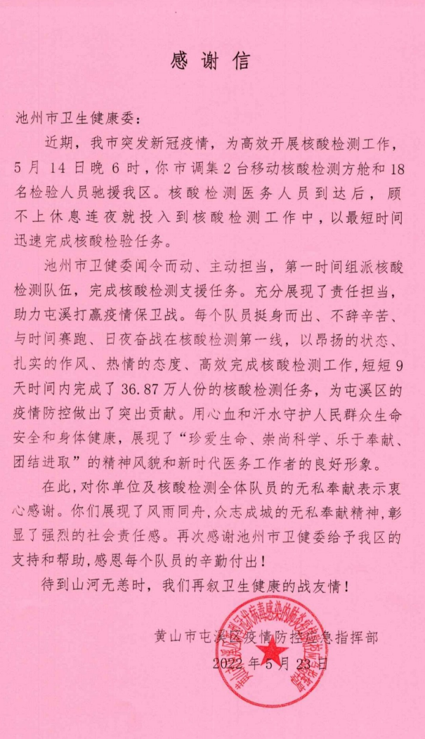 5月20日,屯溪區(qū)領(lǐng)導(dǎo)來我們檢測工作現(xiàn)場對我們進行慰問,對我們的工作作出了肯定,并詢問我們后勤保障狀況。5月23日,在當(dāng)?shù)貐^(qū)政府領(lǐng)導(dǎo)的歡送下,我們結(jié)束了此次支援黃山抗疫支援任務(wù)。我們池州支援隊于當(dāng)天下午到達(dá)池州,并于東榕酒店進行集中隔離。