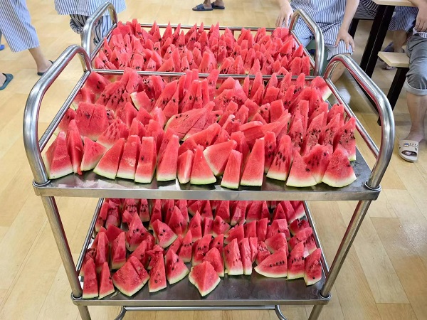 7月21日上午,市三院副院長(zhǎng)劉隆盛委托食堂負(fù)責(zé)人代為采購(gòu),自費(fèi)1500元為六個(gè)病區(qū)400多位患者送去西瓜。