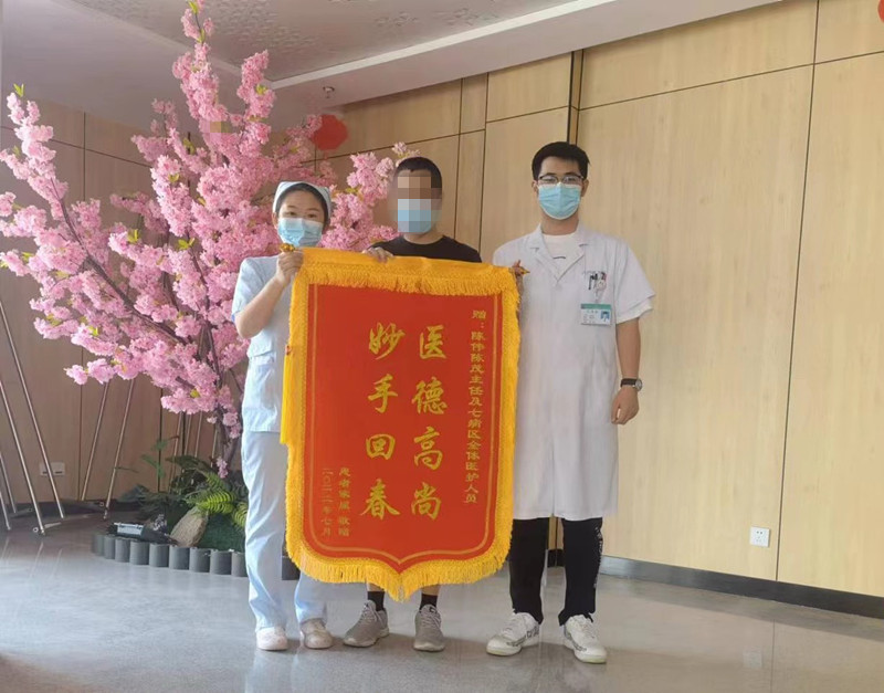 7月25日上午,患者劉某家屬將印有“醫(yī)德高尚 妙手回春”的錦旗,鄭重地送到七病區(qū)醫(yī)護人員手中。