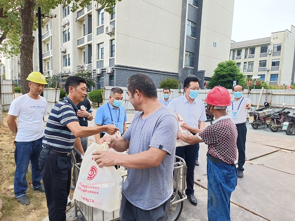 8月25日下午,市衛(wèi)生健康委黨組書記、主任劉保權(quán)一行,深入市三院醫(yī)學(xué)影像樓建設(shè)項(xiàng)目工地,對(duì)在高溫酷暑中堅(jiān)守一線建設(shè)者們表示親切的慰問和感謝,并給他們送去清涼油、花露水、驅(qū)蚊水、礦泉水、香皂及人丹清涼降溫慰問品和藥品。市三院黨委書記、院長(zhǎng)唐達(dá)亮及有關(guān)分管領(lǐng)導(dǎo)陪同。
