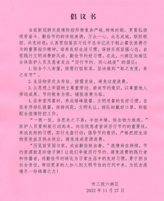 編者按:為保證疫情期間有序的醫(yī)療秩序,市三院按照上級要求實行封閉管理,生活物資保障尤為緊張,我院六病區(qū)積極行動,及時發(fā)出厲行節(jié)約的倡議。