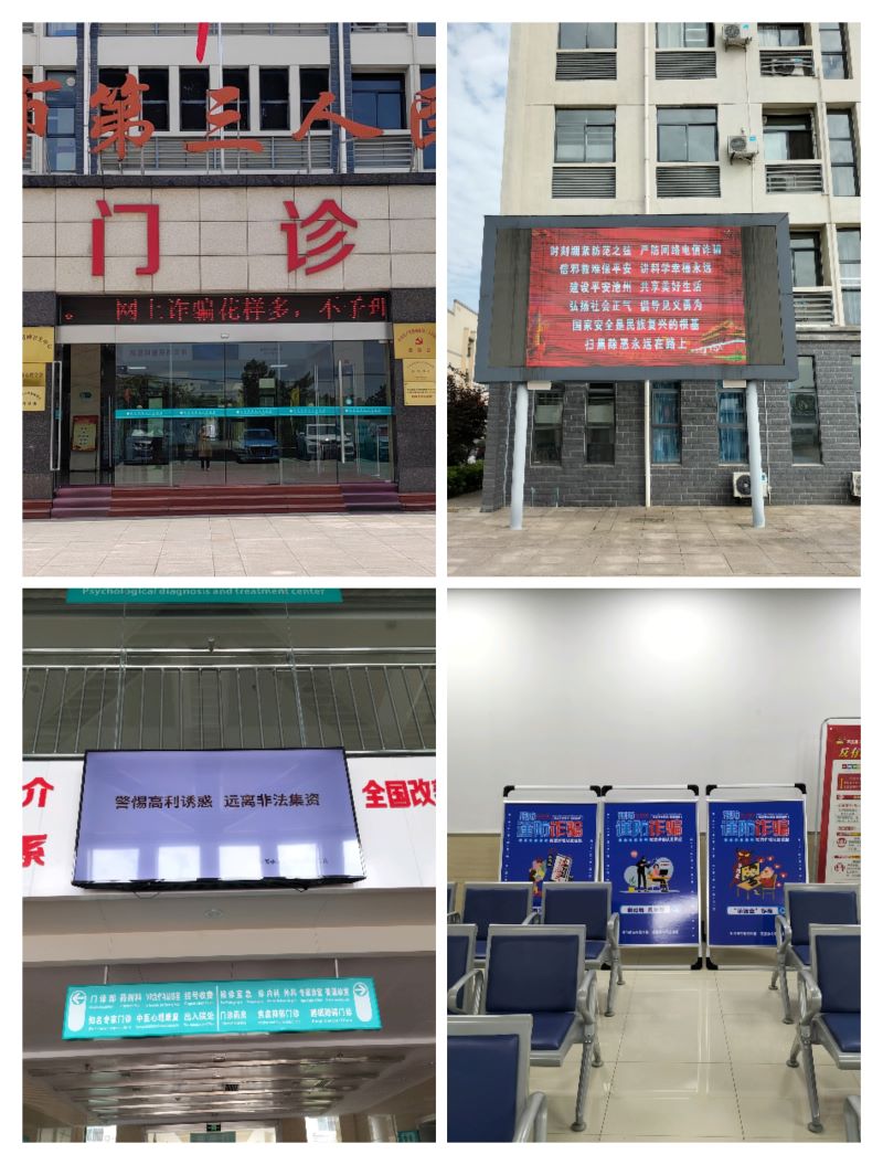 在門急診大廳、住院部、候診大廳等集中區(qū)域和醒目位置設(shè)置反詐防騙宣傳海報(bào)、展板和警示牌,電子顯示屏滾動(dòng)播放反詐防騙宣傳標(biāo)語(yǔ)和反詐短片,網(wǎng)站和微信公眾號(hào)、抖音等新媒體平臺(tái)常態(tài)化推送反詐信息,加強(qiáng)反詐宣傳。