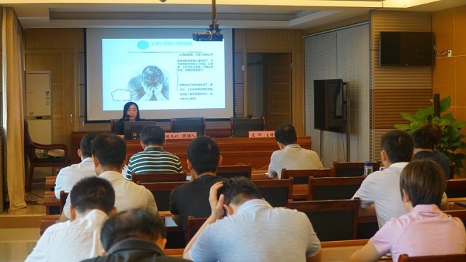 講座現(xiàn)場,周冬竹醫(yī)生主要從公務(wù)人員的心理健康現(xiàn)狀、心理壓力源及心理調(diào)適的方法進行講解,并通過團體催眠、壓力測試、互動提問等環(huán)節(jié)與在場人員進行互動。