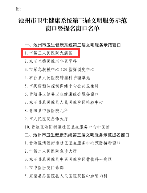 喜報!池州市衛(wèi)生健康系統(tǒng)第三屆文明服務示范窗口名單揭曉——市三院九病區(qū)喜獲命名