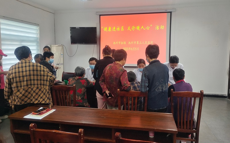 義診現(xiàn)場,三院的5名工作人員耐心細(xì)致的為前來咨詢的居民免費(fèi)量血壓、測血糖、聽心肺、進(jìn)行心理健康咨詢服務(wù),認(rèn)真解答關(guān)于高血壓、糖尿病等常見病以及老年人睡眠障礙的預(yù)防診治。讓居民學(xué)習(xí)到很多預(yù)防疾病的小知識,提高了居民的健康意識、防病意識,真正做到了把健康送到家門口。