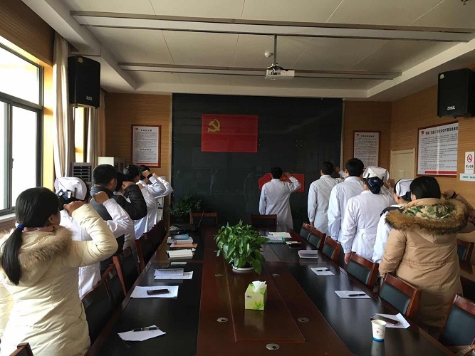 會(huì)上,王勝書記將2018年臨床黨支部黨建工作的方方面面逐一向大家做出匯報(bào),并對(duì)2019年黨建工作計(jì)劃詳細(xì)加以描述。其后的宣誓儀式在莊嚴(yán)雄渾的《國際歌》中正式開始。在王勝書記的帶領(lǐng)下,新預(yù)備黨員和在座老黨員一起右手握拳舉過肩頭,面向鮮紅的黨旗進(jìn)行宣誓,宣誓過程莊嚴(yán)凝重,黨員們用洪亮的聲音表達(dá)著他們?nèi)朦h堅(jiān)定的信念。預(yù)備黨員楊德才同志鄭重向黨組織表達(dá)入黨決心:一是會(huì)堅(jiān)定黨的理想信念,勞記黨的宗旨;二是會(huì)堅(jiān)持全心全意為人民服務(wù)的根本宗旨,不斷提高自己為人民服務(wù)的本領(lǐng)和能力;三是立足自身,按照黨員的高標(biāo)準(zhǔn)嚴(yán)格要求自己,充分發(fā)揮黨員的先鋒模范帶頭作用,爭取早日成為一名合格的中共正式黨員。
