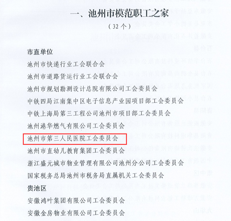 喜報(bào)!市三院工會(huì)委員會(huì)榮獲“池州市模范職工之家” 稱號(hào)
