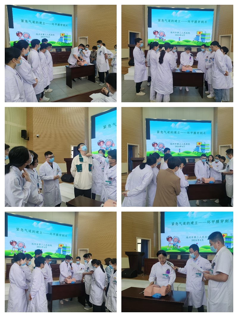 培訓(xùn)現(xiàn)場,陳小勇主任詳細講解了環(huán)甲膜穿刺術(shù)的適應(yīng)癥、用物準備、操作流程及注意事項等內(nèi)容,并現(xiàn)場演示了環(huán)甲膜穿刺術(shù)的操作步驟,使大家對該項技術(shù)有了全面深入的了解。同時,他強調(diào)在緊急情況下,環(huán)甲膜穿刺術(shù)是搶救患者生命的重要手段,醫(yī)務(wù)人員必須熟練掌握此技術(shù),以便在關(guān)鍵時刻為患者急救工作贏得寶貴的時間。