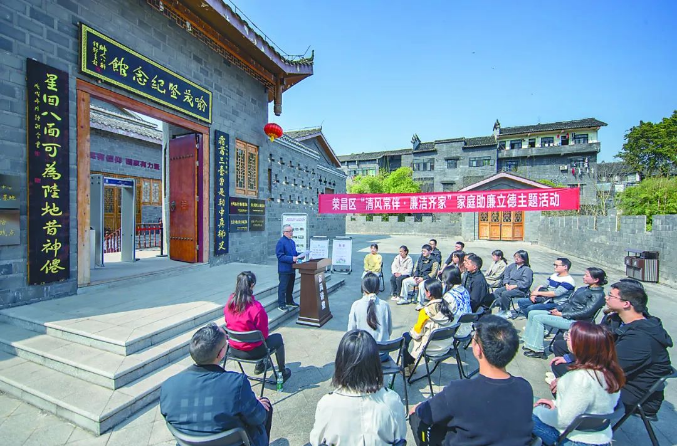重慶市榮昌區(qū)紀(jì)委監(jiān)委聯(lián)合區(qū)婦聯(lián)等單位開展“清風(fēng)常伴·廉潔齊家”家庭助廉立德主題活動(dòng),教育引導(dǎo)黨員干部注重家庭家教家風(fēng)建設(shè)。圖為近日,講解員在喻茂堅(jiān)紀(jì)念館門前為黨員干部及其家屬講述喻氏家族清廉家風(fēng)故事。張春連 攝