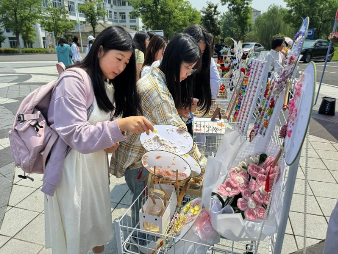 精巧的珍珠手拎包、漂亮的手串、可愛的布織玩偶、精美的油畫……一個個精美而又不乏實用價值的純手工藝品讓師生們大為贊嘆?!拔屹I了幾朵用毛線做的康乃馨,看起來非常精致,準(zhǔn)備在母親節(jié)送給媽媽?!痹撔at(yī)療衛(wèi)生技術(shù)系醫(yī)美專業(yè)學(xué)生翟雯悅對剛買的工藝品愛不釋手。