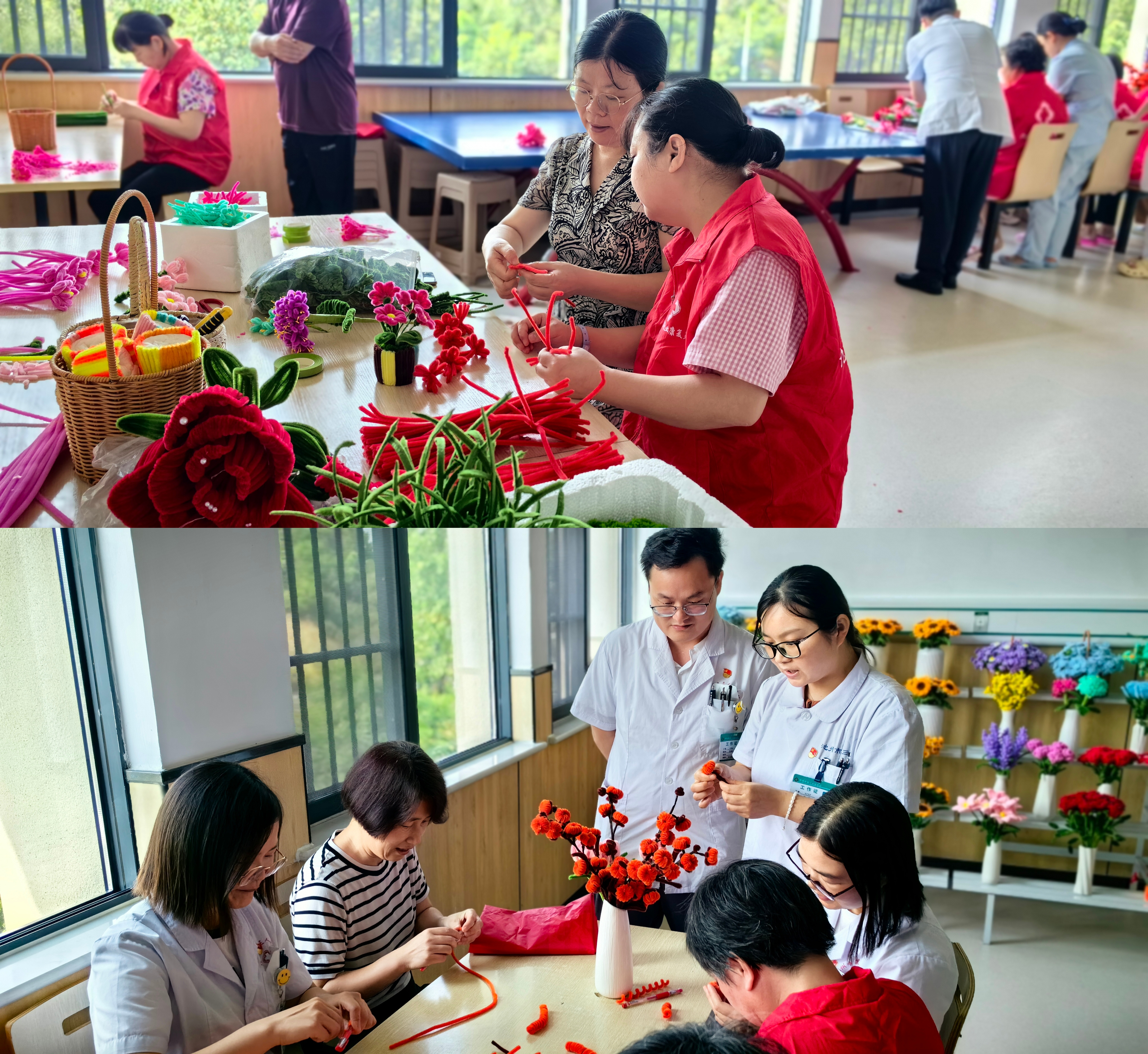 活動(dòng)通過制作扭扭棒手工花卉的形式開展,扭扭棒是由鐵絲和絨毛組成的一種手工材料,是當(dāng)下頗為流行的小手工?;顒?dòng)現(xiàn)場(chǎng),黨員護(hù)士結(jié)合實(shí)物為大家詳細(xì)講解扭扭花的制作方法和技巧,大家積極主動(dòng),將一根根小小的扭扭棒扭一扭、剪一剪、繞一繞,場(chǎng)面熱鬧非凡。不一會(huì)兒,一朵朵精美的花卉在指尖悄然“綻放”,笑意在嘴角“流動(dòng)”。大家將制作完成的扭扭花互相贈(zèng)送,傳遞著感恩與美好。