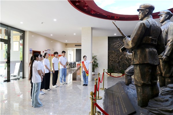 講解員章寧為大家介紹了烈士紀念塔的寓意:“塔高28米,象征著中國共產(chǎn)黨領(lǐng)導中國人民成立中華人民共和國艱苦奮斗的28年;也寓意著中共貴池特支建立于1928年,貴池光榮的紅色革命歷程從這一年開始……”烈士紀念塔由兩個三棱體組成,通體為暗紅色花崗巖壘砌,代表著烈士鮮血染紅的貴池大地;塔頂似鐮刀斧頭組成的黨旗飄入云間,呈現(xiàn)著民族的使命和歷史的滄桑。