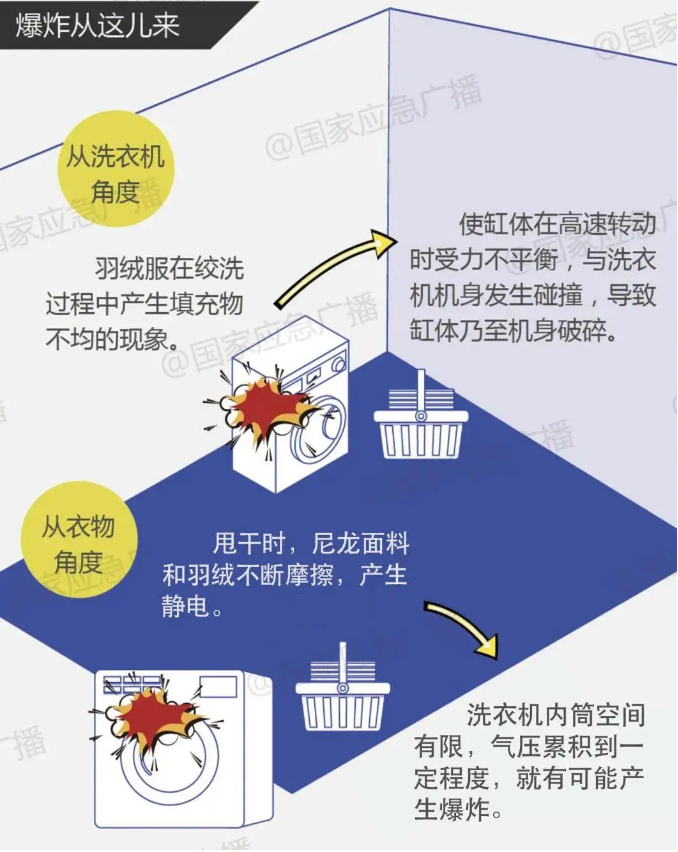 清洗羽絨服時(shí),浸濕的羽絨會(huì)聚集成團(tuán),導(dǎo)致羽絨服內(nèi)產(chǎn)生大面積空隙。高速甩干時(shí),吸飽水的羽絨不斷膨脹,羽絨服內(nèi)空氣受到擠壓,而防水涂層又阻礙了氣體排出,可能會(huì)使羽絨服不斷被撐大,甚至將洗衣機(jī)內(nèi)筒撐滿,引發(fā)爆炸。
