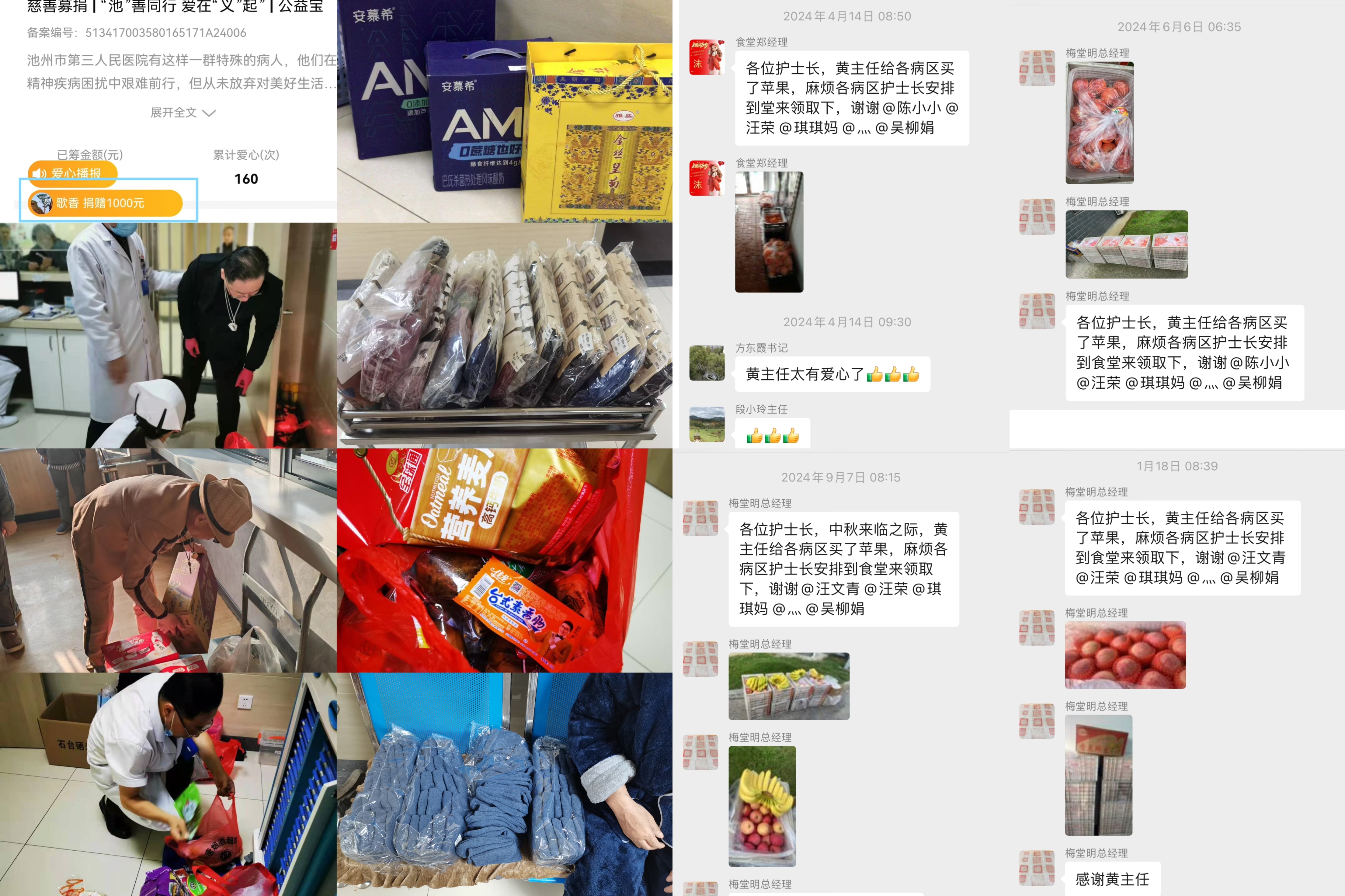 精神障礙患者是一個(gè)特殊的弱勢(shì)群體,據(jù)了解,市三院住院患者大多來(lái)自偏遠(yuǎn)農(nóng)村家庭經(jīng)濟(jì)困難,無(wú)法得到親人的及時(shí)關(guān)懷,經(jīng)常下病區(qū)檢查的黃銘將這些看在眼里、記在心里。于是,黃銘經(jīng)常性自費(fèi)為患者購(gòu)置水果、牛奶、下飯菜、方便面、零食等物資,每逢春節(jié)、中秋、端午等傳統(tǒng)佳節(jié),更是保證四五百名患者人手一蘋果。氣溫驟降時(shí),他首先想到的是患者是否保暖。每年立冬前,黃銘都會(huì)準(zhǔn)備好冬襪送到病區(qū)。熱心腸的他踴躍參與患者營(yíng)養(yǎng)改善計(jì)劃,累計(jì)捐資數(shù)千元改善患者伙食。2024“池”善同行、愛(ài)在“義”起項(xiàng)目啟動(dòng),他再度解囊,獻(xiàn)出1000元,以點(diǎn)滴善舉傳遞無(wú)疆大愛(ài)。無(wú)數(shù)個(gè)365天里,黃銘總是不經(jīng)意間為患者帶來(lái)雨天里的感動(dòng)、冬日下的溫暖、節(jié)日間的驚喜,讓病區(qū)處處充盈著愛(ài)意,成為患者安心棲息的溫暖港灣。他的善舉不僅惠及患者,對(duì)物業(yè)、安保等人員也同樣關(guān)懷備至。物業(yè)徐某猝然離世,他慷慨解囊相援,捐資1000元以慰家屬;一名安保人員生病住院,他數(shù)次攜慰問(wèn)品前來(lái)探視,關(guān)切地詢問(wèn)其病情,暖心寬慰其父親,盡顯仁善之心。多年來(lái),他在各方面獻(xiàn)出的愛(ài)心善款不計(jì)其數(shù)