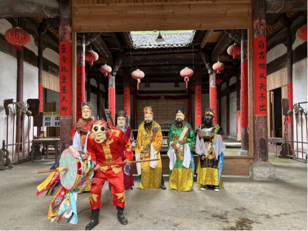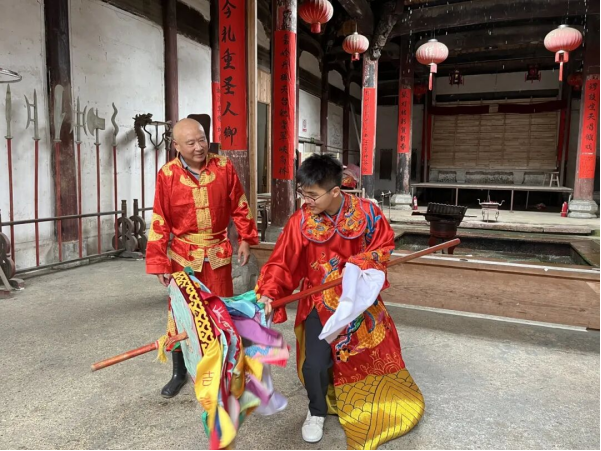 “身子半蹲,腳踮起來(lái),手抖起來(lái)……”午后的姚氏宗祠里,姚家偉正在指導(dǎo)徒弟舞傘。他一邊講解,一邊示范,每個(gè)動(dòng)作都精益求精。28歲的姚東跟隨姚家偉學(xué)習(xí)儺戲已有10年?!皫煾附虒W(xué)極其認(rèn)真,每個(gè)動(dòng)作都反復(fù)示范,直到我們完全掌握為止。他對(duì)儺戲的熱愛(ài)和執(zhí)著感染了我?!币覀サ膬鹤右δ闲墙衲?0歲,也是一名儺戲傳承者。作為中學(xué)教師,他常在教學(xué)之余為學(xué)生表演儺戲。“從小父親就教我儺戲,現(xiàn)在我主要學(xué)習(xí)儺戲唱腔。希望能有更多年輕人了解并喜歡上這門傳統(tǒng)藝術(shù)。”