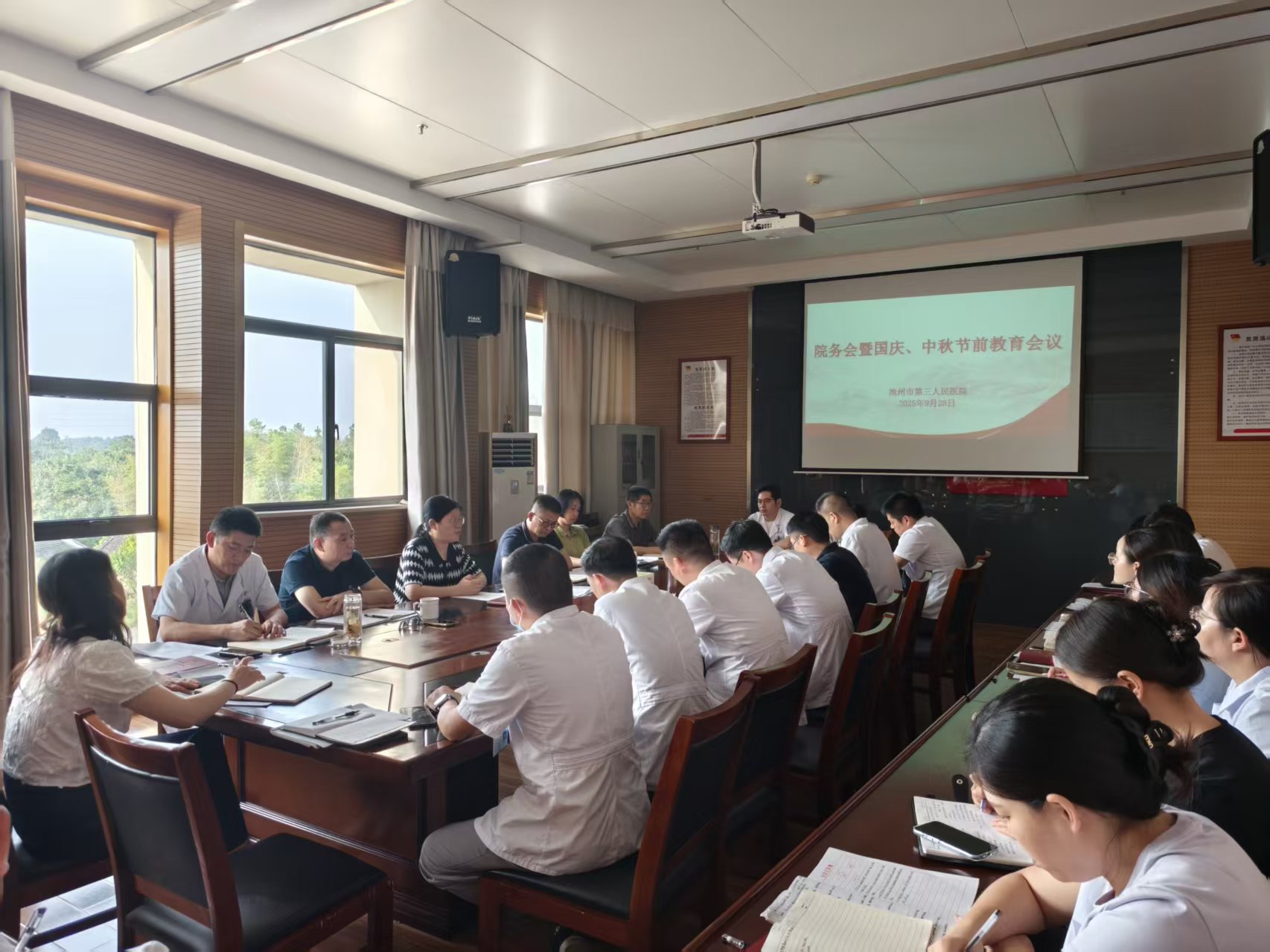 為確保2025年國慶、中秋“雙節(jié)”期間院內(nèi)患者平安祥和過節(jié),9月28日下午,市三院召開院務(wù)會暨節(jié)前教育會議,黨委書記方東霞,院長劉隆盛及領(lǐng)導(dǎo)班子成員、各科室負責(zé)人40余人參加。