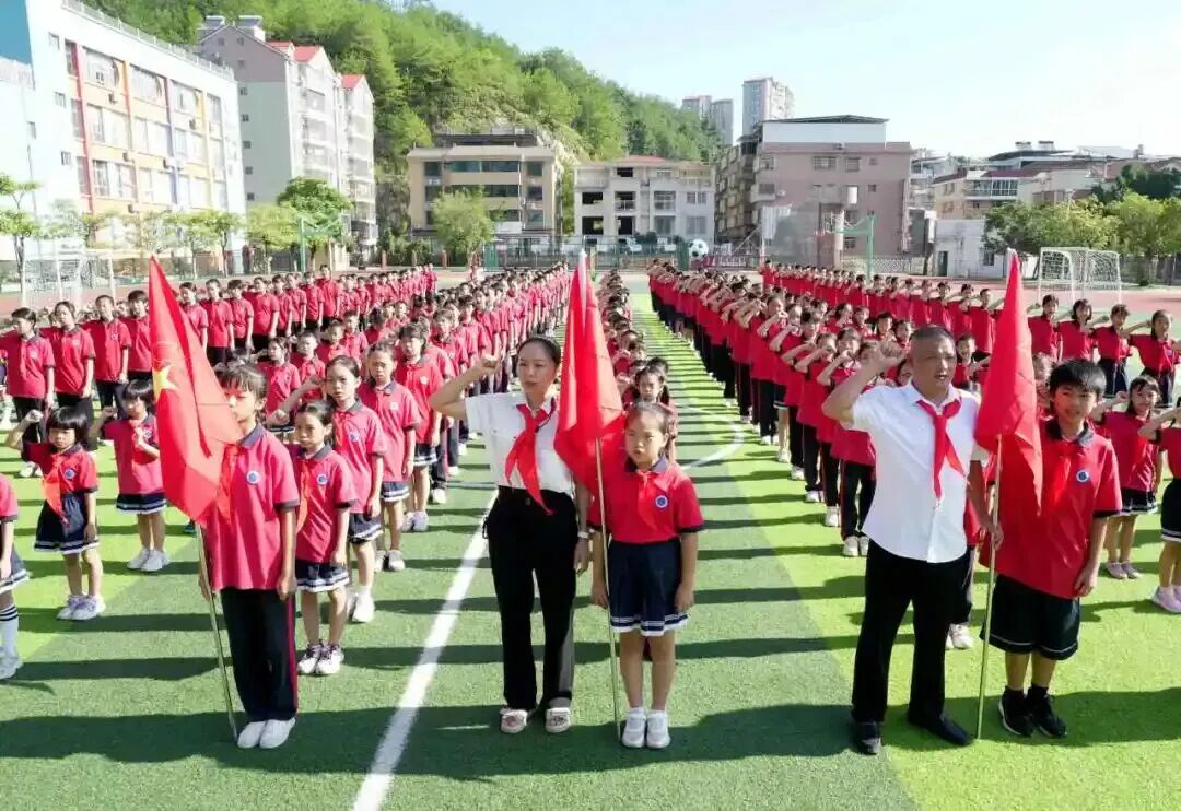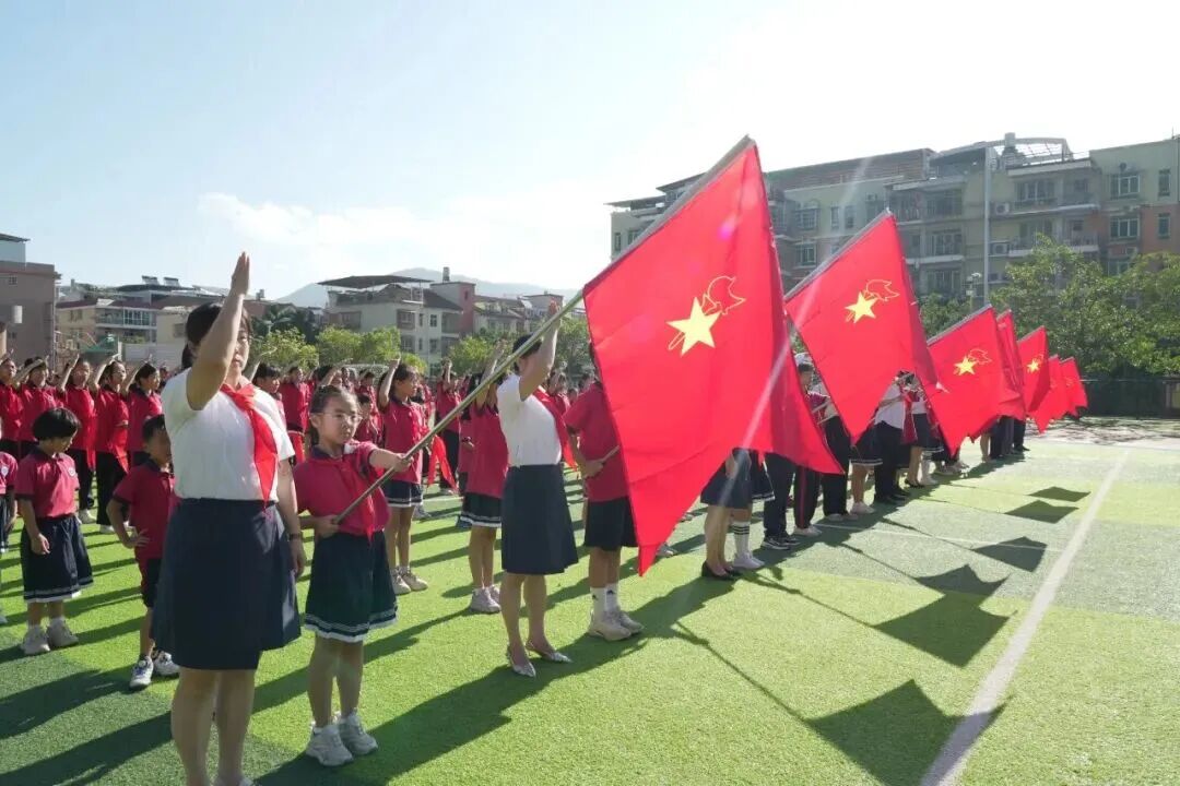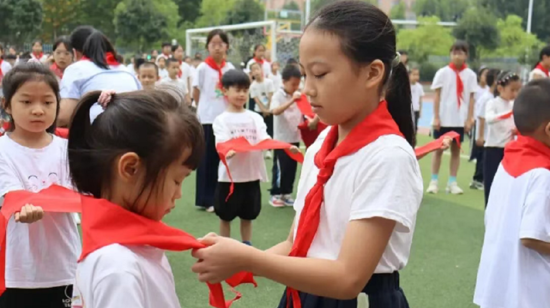 出席活動(dòng)的老師與老隊(duì)員們一起為新隊(duì)員佩戴上鮮艷的紅領(lǐng)巾。在國(guó)旗下、隊(duì)旗旁,新隊(duì)員們胸前的紅領(lǐng)巾隨風(fēng)飄揚(yáng),他們眼神堅(jiān)定,在校大隊(duì)輔導(dǎo)員的帶領(lǐng)下,進(jìn)行了鏗鏘有力的宣誓。活動(dòng)不僅增強(qiáng)了少先隊(duì)員的光榮感和歸屬感,也激勵(lì)了隊(duì)員們?yōu)閳?bào)效祖國(guó)貢獻(xiàn)智慧與力量,讓星星火炬在民族復(fù)興的征程中綻放更加燦爛的光芒。