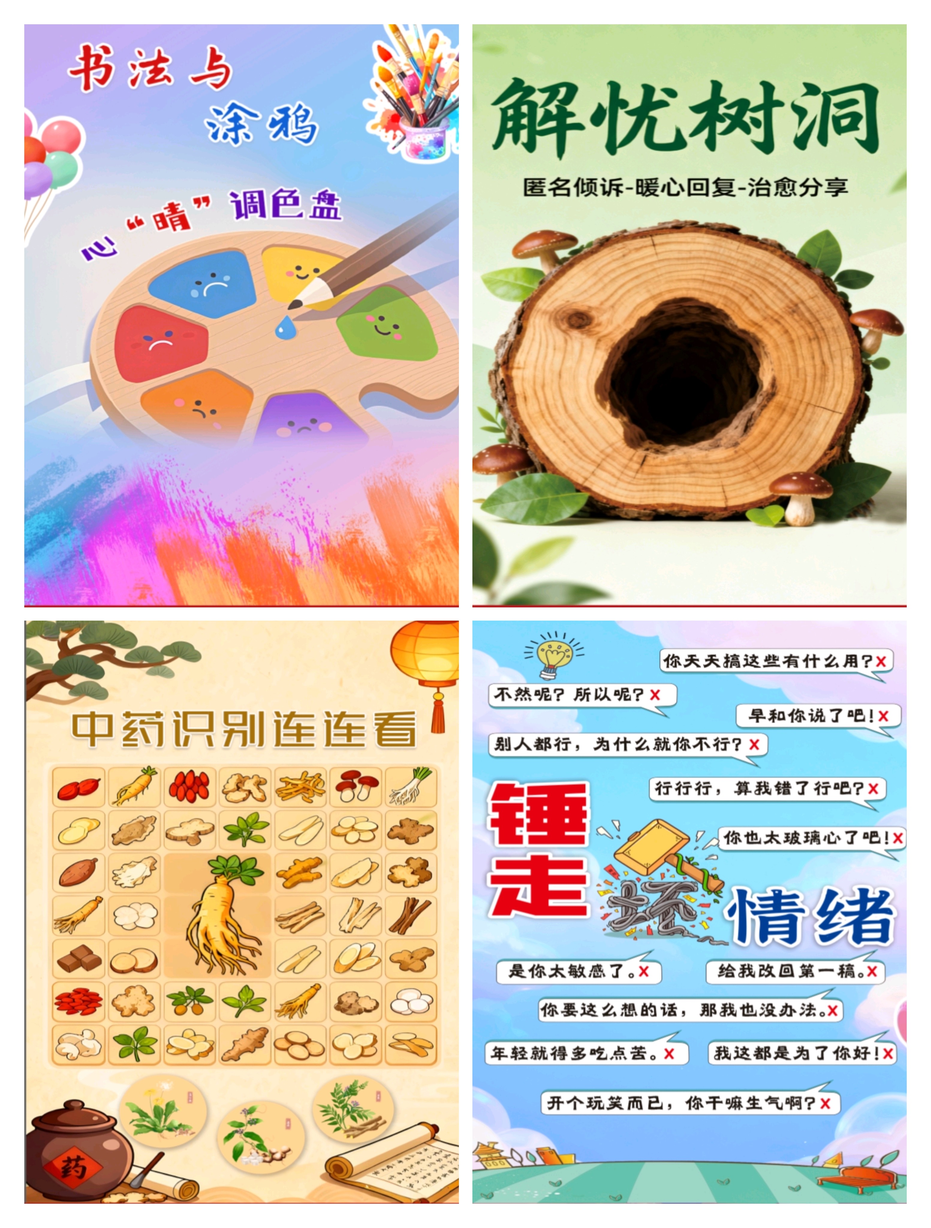 四大體驗式游戲,引導情緒釋放與心靈滋養(yǎng):書法與涂鴉——以靜制動,修養(yǎng)心性;情緒樹洞——安放煩惱,收獲暖光;中藥識別連連看——認知本草,尋方解郁;錘走壞情緒——釋放壓力,輕裝前行。讓您在互動中領(lǐng)會“身心一體、情志相調(diào)”的中醫(yī)理念。