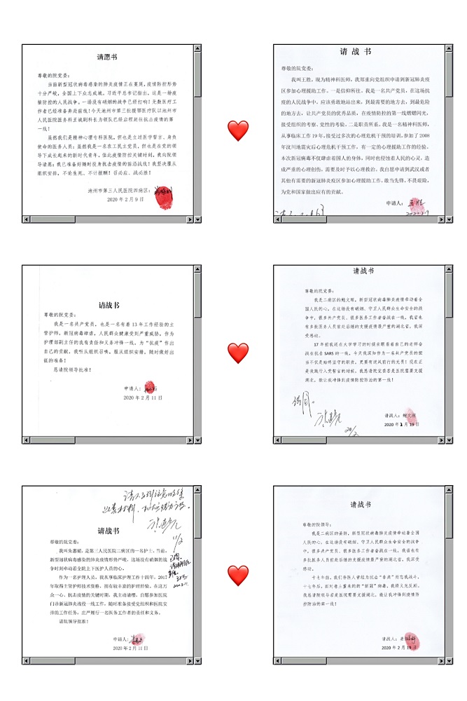 “我志愿加入中國共產黨…為防疫工作貢獻力量…愿堅守在防疫戰(zhàn)斗的第一線”“隨時聽候調令,奔赴防疫一線,義無反顧,不計報酬,不論生死”“雖然我們是精神心理??漆t(yī)院,…但我已準備好隨時投身抗擊疫情的前沿戰(zhàn)線”。