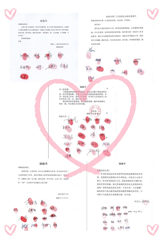 請戰(zhàn)是對信念與信念的付諸行動,申請是對情懷與宗旨的執(zhí)著追求。一個個義無反顧的紅手印飽含決心,一個個紅手印、飽含了醫(yī)務工作者“敬佑生命、救死扶傷、甘于奉獻、大愛無疆”的責任擔當與戰(zhàn)勝疫情的必勝信心。