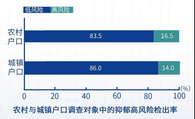 對(duì)戶口類型不同的調(diào)查對(duì)象進(jìn)行分析,發(fā)現(xiàn)抑郁水平在統(tǒng)計(jì)上存在顯著差異。農(nóng)村戶口人群中抑郁高風(fēng)險(xiǎn)的檢出率為16.5%,略高于城鎮(zhèn)戶口的檢出率14.0%。