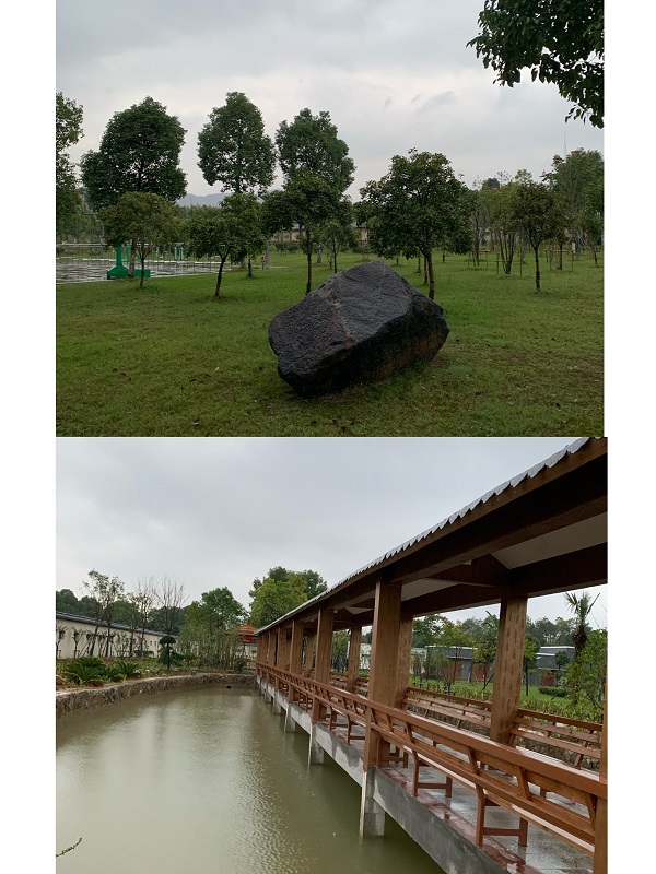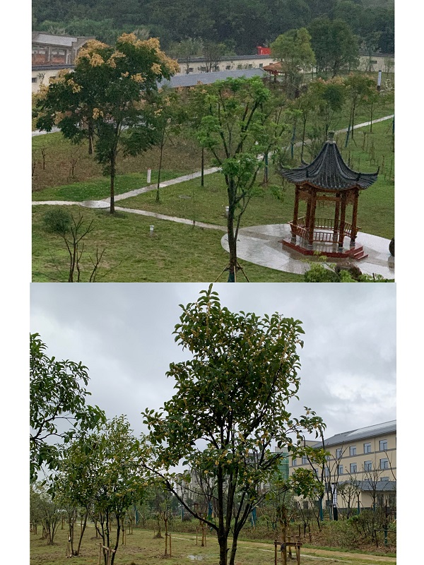 今天我值班,天下著小雨,準(zhǔn)備看看前段時(shí)間因長時(shí)間晴好天氣而干涸的“尚賓榭”和旁邊的荷花塘,但走到配電房時(shí),一陣桂花香撲面而來。雨中小游的想法油然而生,沿著尚未完工的小路,走到“尚賓榭”時(shí),發(fā)現(xiàn)水榭中水近一米深,連接荷花塘的水管已看不到水的流動(dòng)。當(dāng)走到“尚賓榭”中央時(shí),遠(yuǎn)處又飄來一陣桂花香,巡著花香方向,走到今年新栽的花的方陣,原來是市住建局贈送移植的桂花開放了,那香味像一根琴弦撥動(dòng)了我的心琴,讓我流連忘返。
