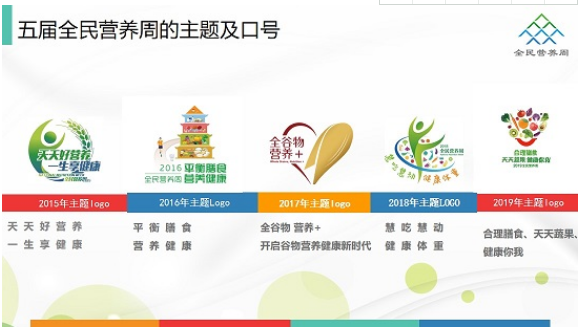 2015-2019年,全民營(yíng)養(yǎng)周歷屆logo及主題。